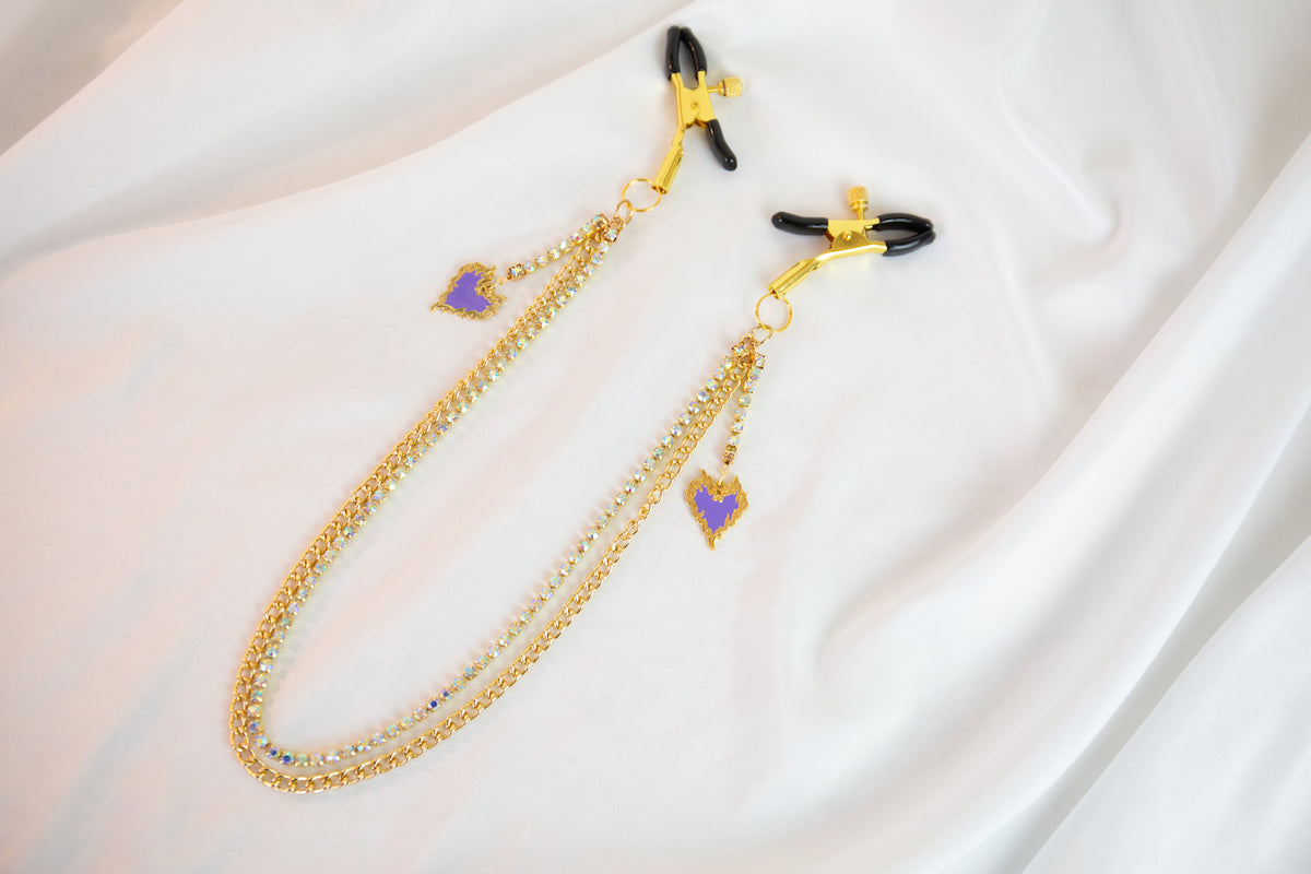 Let's light a fire, baby. Burning love clamps feature lilac burning gold heart charms, rainbow cupchain, and adjustable clamps. A clamp set made for lovers ready to light things up.